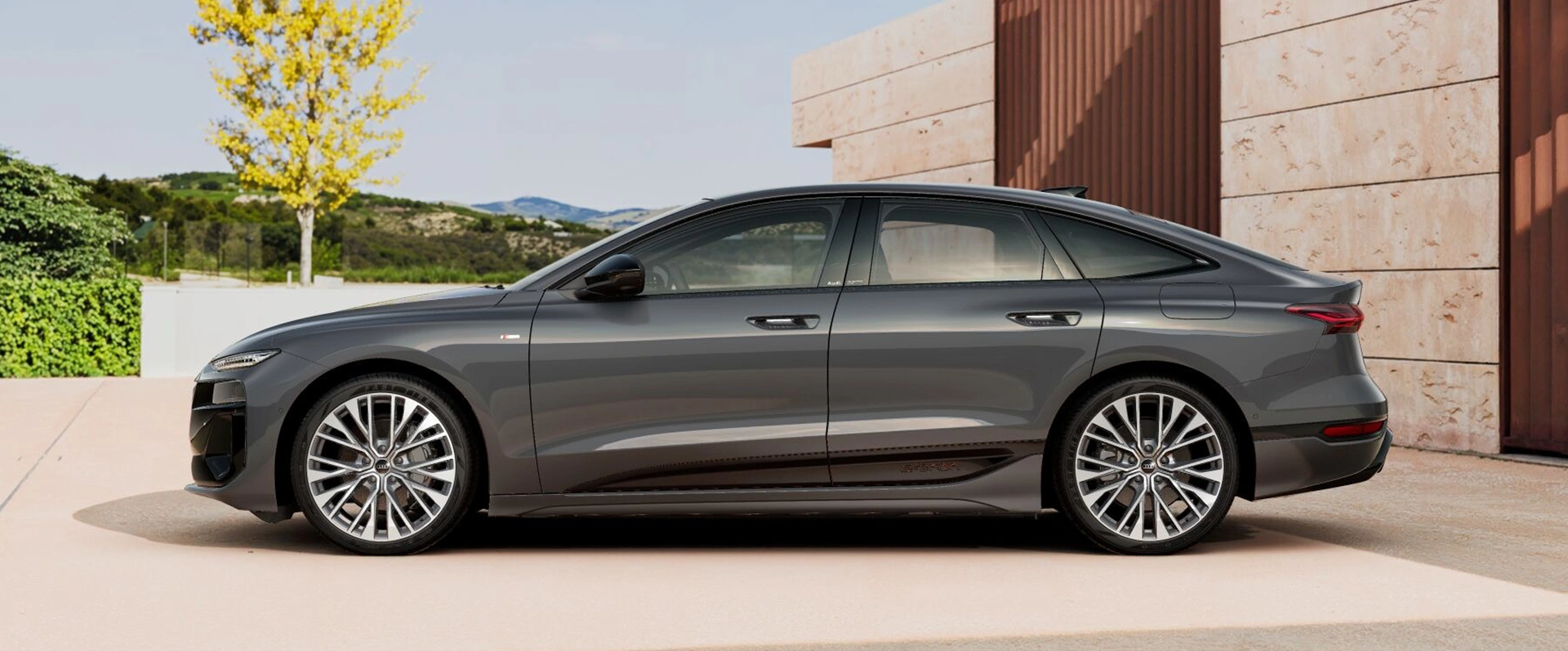Rodas grandes, balanços curtos e uma cabine plana sob o teto curvo estilo cupê enfatizam as proporções esportivas. O design traseiro, enfaticamente largo, é caracterizado pela faixa de luz contínua com os anéis Audi iluminados acima. As proporções fortes e esportivas são sublinhadas pelo impressionante difusor traseiro.