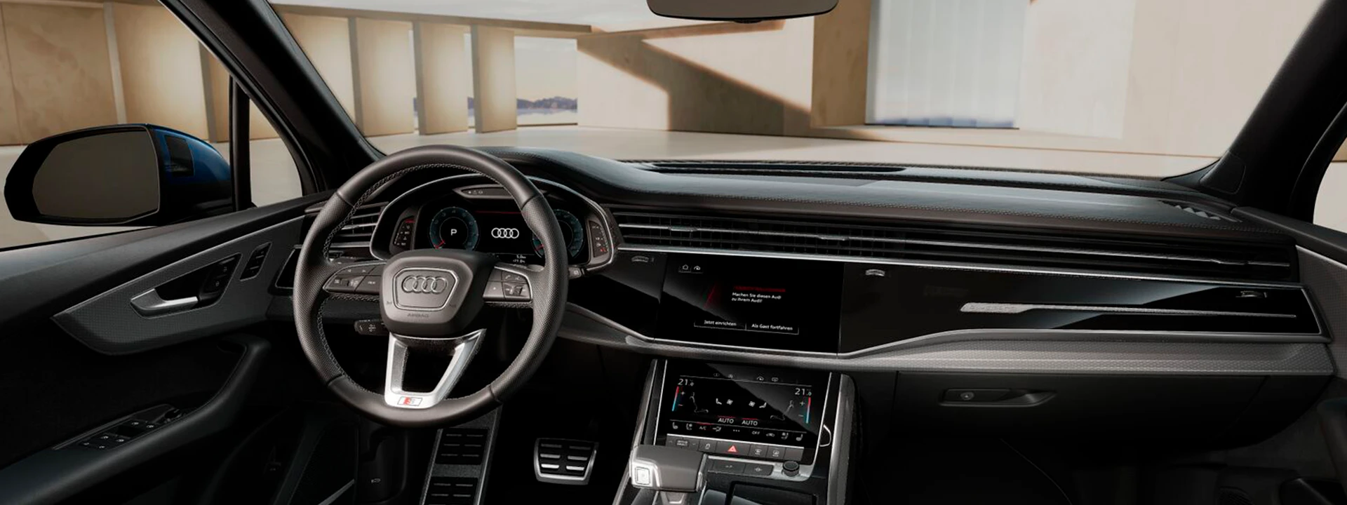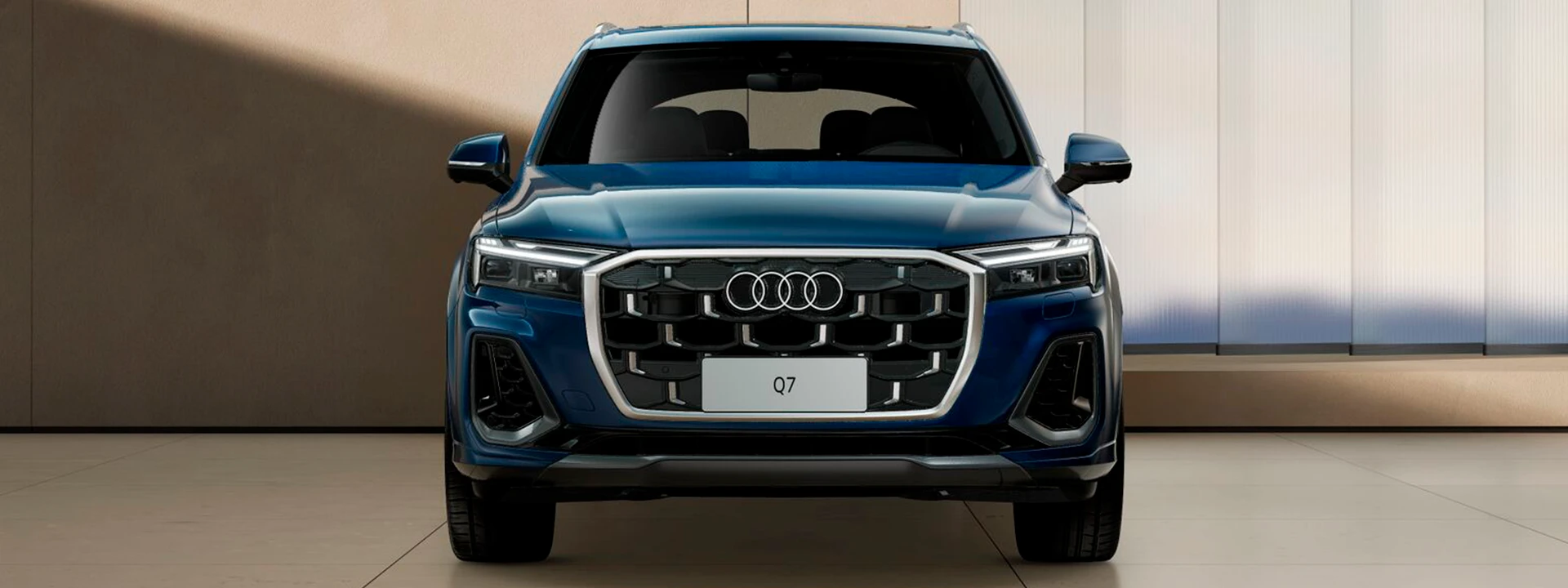 O novo Audi Q7 SUV exibe seu DNA off-road com arquitetura quattro clássica e uma poderosa linha de design. O impressionante Audi Singleframe, os anéis Audi em aparência 2D plana e, em particular, as características do pacote S line exterior contribuem para sua aparência esportiva.